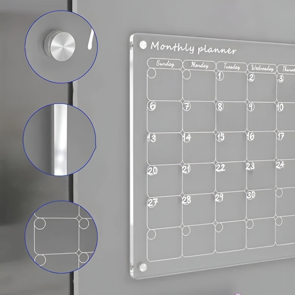 A papír alapú naptárak egy hónap után lejárnak, és egyenesen a kukában végzik. A tiszta akril felület teljesen tisztára törölhető másodpercek alatt a mellékelt kendővel – nincs szellemkép, nincs folt, nincs maradék. A felület karcálló és foltmentes, így kristálytiszta marad több száz letörlés után is.