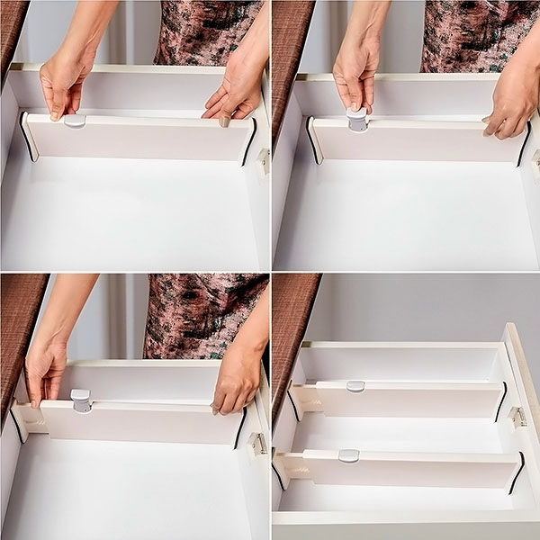 Másodpercek alatt átalakítja zsúfolt fiókjait. Az egyszerű “mozditsd és kattintsd” telepítéssel a rendszerezés még sosem volt ilyen egyszerű. Csak helyezze, állítsa be és rögzítse az elválasztót a helyére – nincs szükség szerszámra vagy ragasztóra.