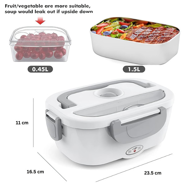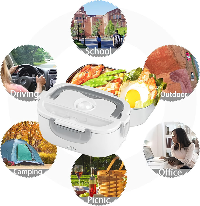 A 2 kivehető PP rekesz külön tartja a főételt és a köretet – utána pedig mindkettő egyenesen a mosogatógépbe mehet. Működik az irodában, az autóban, egy építkezésen, vagy bármelyik szobában, ahol van konnektor.