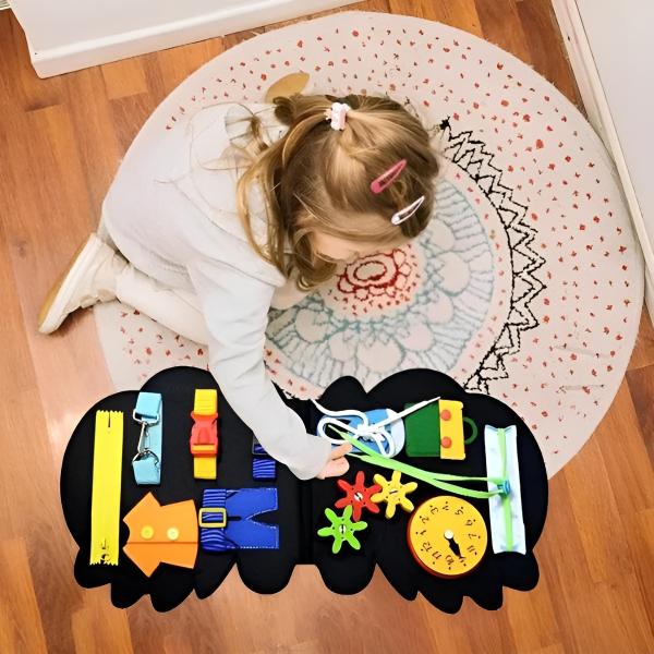 A kisgyermek a cipzárakkal, kapcsokkal, fogaskerekekkel, órákkal, cipőfűzőkkel és egyebekkel fog foglalkozni.